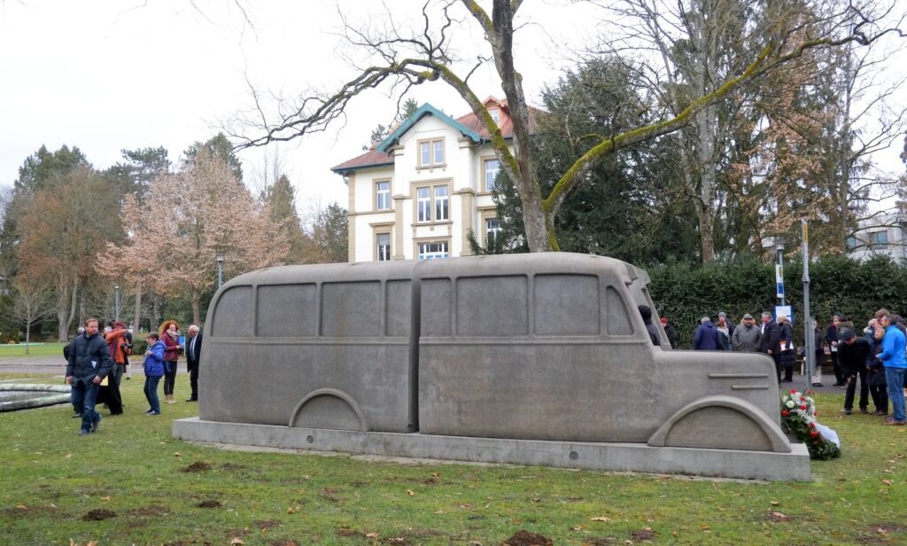Der Rassenwahn der Nationalsozialisten traf auch Menschen mit Behinderungen und psychischen Erkrankungen. Das „lebensunwerte Leben“ würde den Volkskörper schädigen. Der sogenannten „Euthanasie-Aktion“ fielen 300 000 Menschen zum Opfer. Mehr als 70 000 Patienten wurden 1940/41 in Vernichtungslagern vergast. Sie wurden meistens in Bussen von den „Heil- und Pflegeanstalten“ zu den Vernichtungslagern transportiert. Die Künstler Horst Hoheisel und Andreas Knitz bildeten 2005 einen solchen Bus in grauem Beton nach. Zwei Exponate sind stationär aufgestellt und einer ist transportabel. Er wurde bereits an 16 Orten aufgestellt, so auch in Emmendingen.