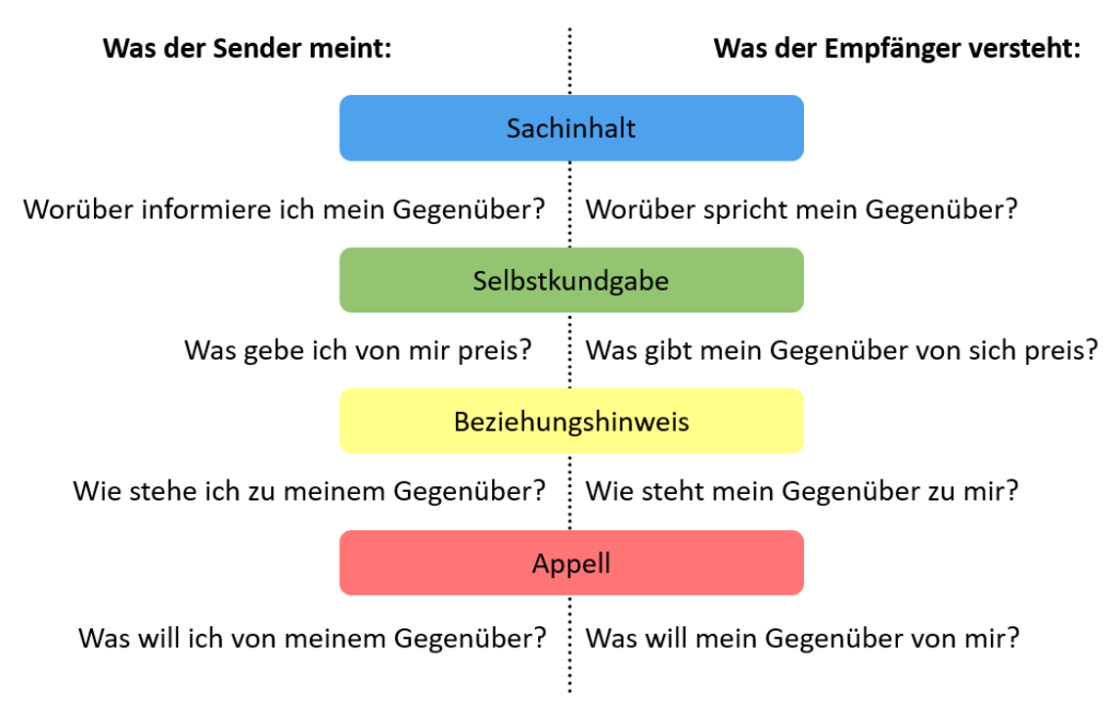An diesem Gespräch sehen wir, dass der Empfänger einer Botschaft etwas ganz anderes verstehen kann, als der Sender der Botschaft übermittelt hat. In der alltäglichen Kommunikation tätigen wir bewusst oder unbewusst Aussagen, die auf vier unterschiedlichen Ebenen sowohl gesendet als auch empfangen werden können. Diese vier Ebenen werden durch die vier Personen in diesem Gespräch veranschaulicht. Dabei spielen auch Tonfall, Mimik und Gestik eine große Rolle. Das 4-Ohren-Modell zeigt, wie Missverständnisse entstehen können.